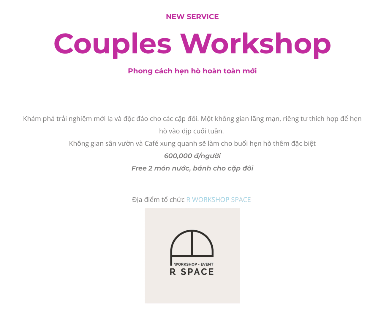 Tại không gian buổi tối của R Workshop Space, hoàn toàn mới lạ, đó là điều mà nhiều người nói về không gian này. Giờ đây bằng việc đưa vào không gian đó trải nghiệm Workshop, nhưng đặc biệt ở chỗ, chỉ có các cặp đôi trong khung giờ từ 18-20h các ngày thứ 6, 7 và CN mới được đăng ký. NOTE muốn một điều gì đó thật đặc biệt cho những ai đang yêu nhau, hoặc có thể là mới đang trong giai đoạn tìm hiểu. NOTE tin rằng thông qua trải nghiệm cùng nhau làm Workshop, họ sẽ có được thời gian bên nhau đáng nhớ và đáng tiền cho một buổi hẹn hò.