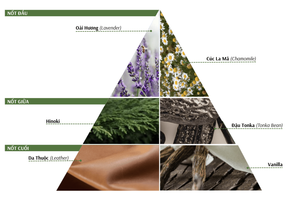 Ở tầng cuối, Tale of Hinoki khép lại bằng sự ấm áp và mềm mại của đậu Tonka, vanilla và da thuộc.